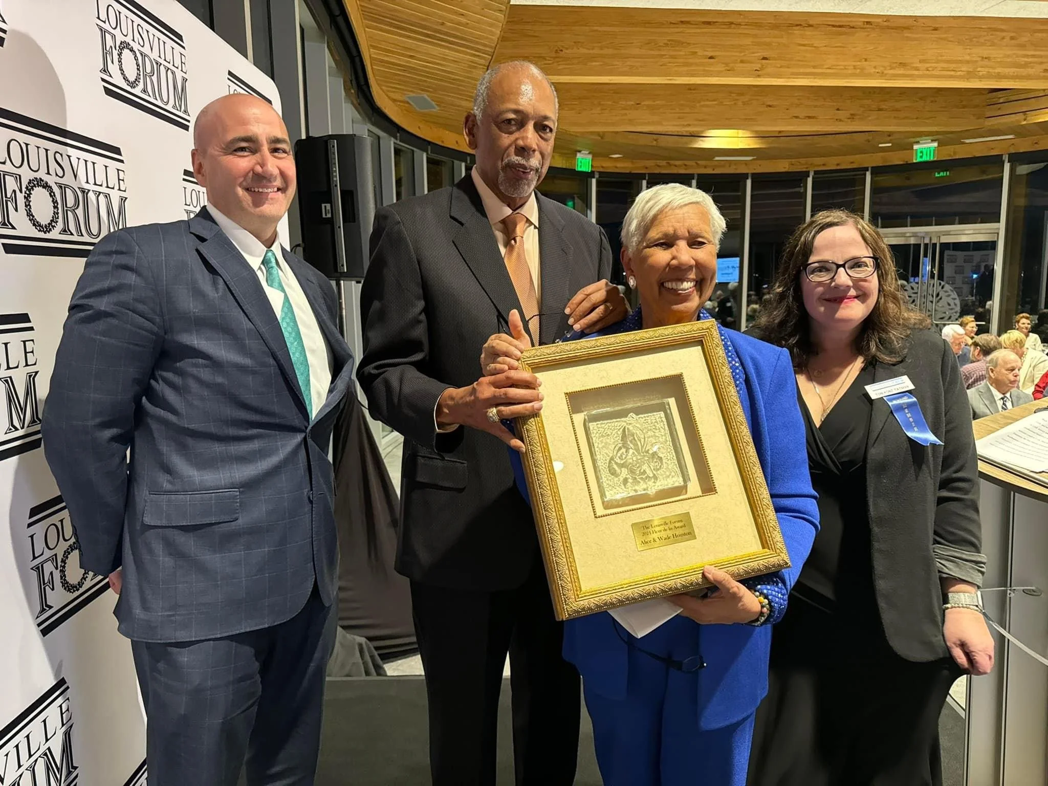(l to r) Louisville Forum Vice President Tom Coffey, Wade Houston, Alice Houston, Louisville Forum Board Member Toni Konz Tatman
